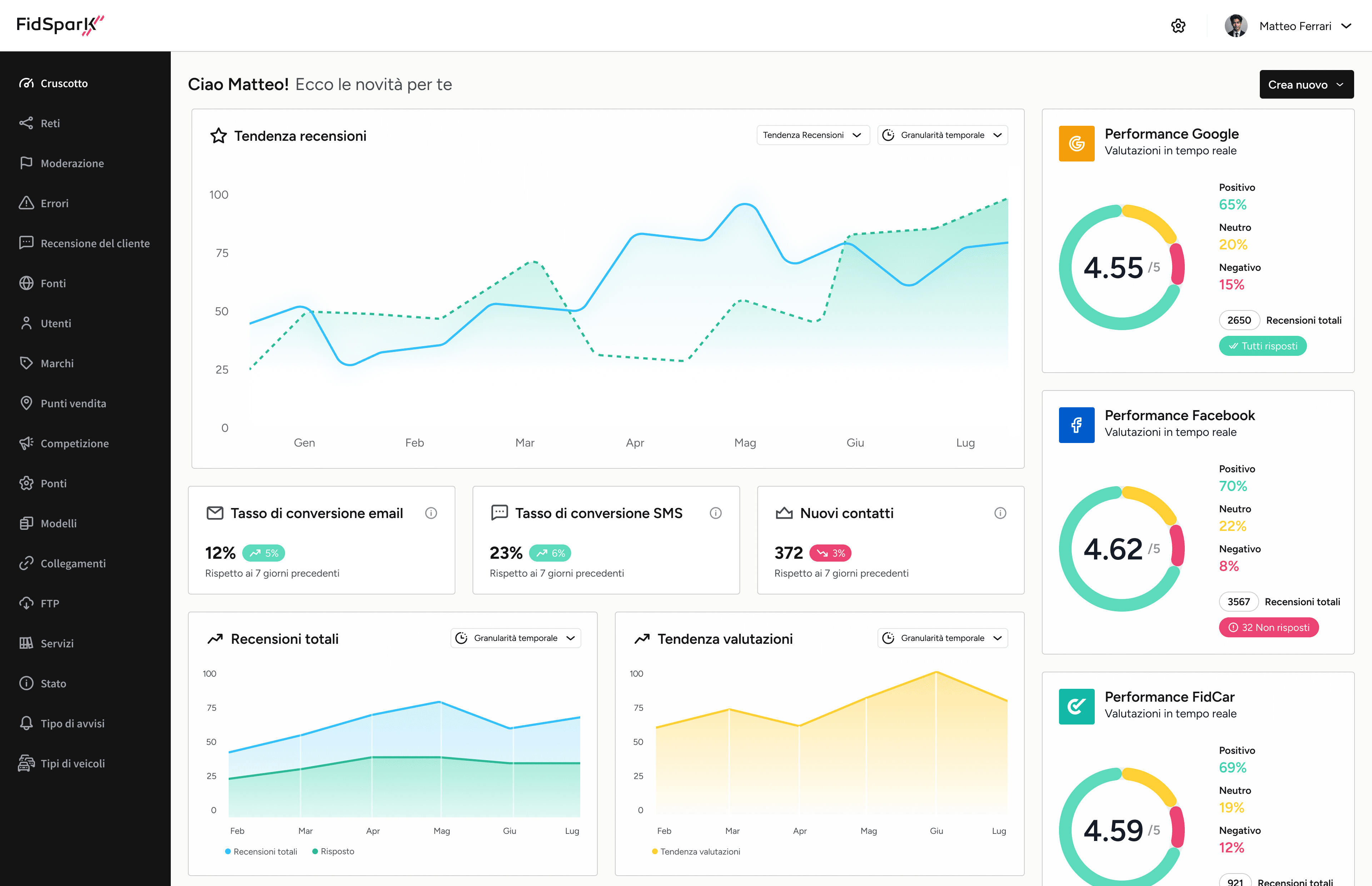 Ottieni visibilità completa grazie a report automatizzati che monitorano trend delle recensioni, valutazioni e tempi di risposta. La nostra AI analizza gli aspetti chiave dell’esperienza cliente, consentendoti di filtrare per servizio, brand o sede per confrontare facilmente le performance della tua rete e restare un passo avanti rispetto alla concorrenza.